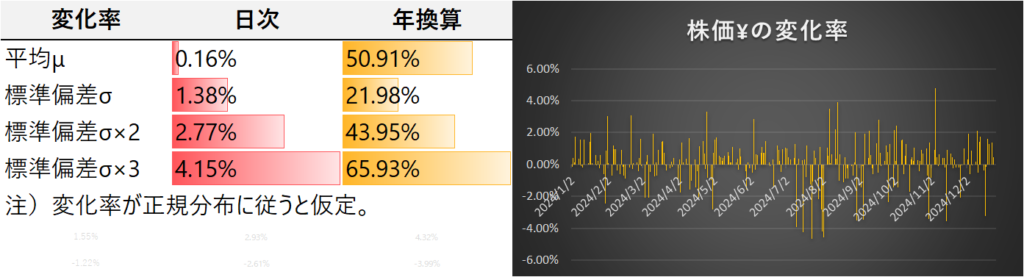 今回、株価の日次変化率が正規分布に従うと仮定しました。